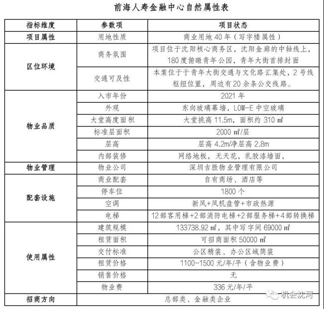 项目简介:前海人寿金融中心是前海人寿不动产管理平台进驻东北区域的首个商务标杆作品。项目建筑规模13万余平方米,其中写字间近7万平方米,目前可招商面积5万平方米,租赁价格1100-1500元/年/平(含物业费)。