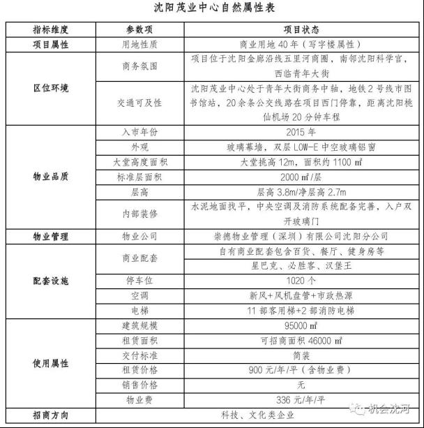 项目简介:沈阳茂业中心是集甲级写字楼、购物中心(茂业百货)、高档公寓、豪华住宅的综合性项目,大厦外立面采用远大玻璃幕,保温隔音,节源美观,建筑面积10万平方米,可招商面积4.6万平方米,租赁价格900元/年/平(含物业费)。