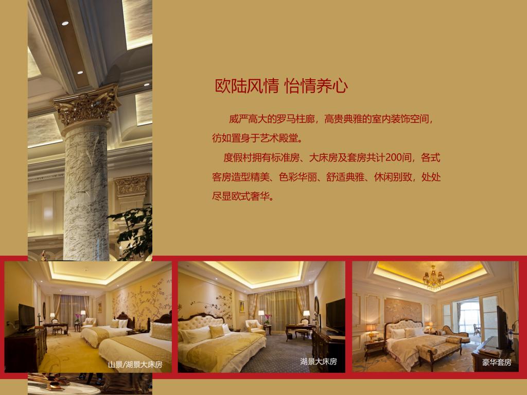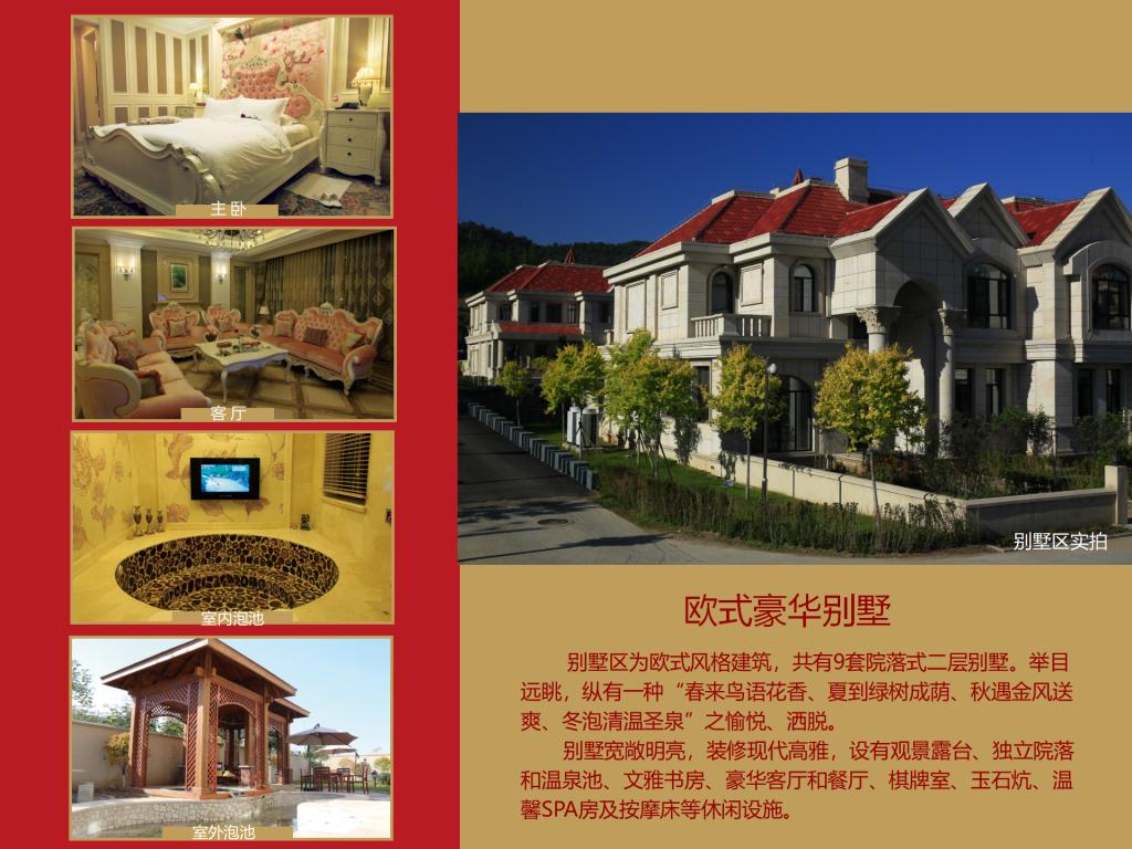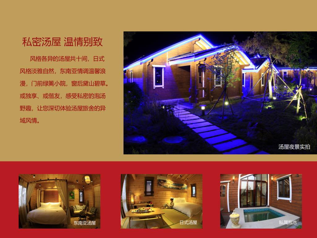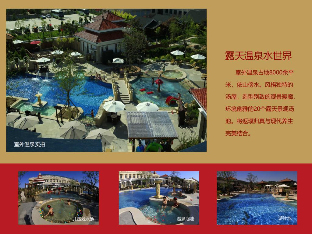 碧湖温泉度假村项目总投资86,646.04万元,占地234.12亩,总建筑面积50,151.62㎡,其中:宴会中心3,472.25㎡,设有一个宴会大厅、七个会议室,可容纳300人的会议及就餐;酒店27,038.14㎡,设有客房200间,餐饮包房17间,多功能餐厅一个能容纳150人同时就餐,员工食堂一个可同时容纳200人就餐;两栋贵宾楼4,300㎡,设有客房9套;温泉中心(室内温泉)11,866.51㎡,设有各种泡池25个及一个9米×20米的游泳池,日可接纳1,300人/次洗浴;室外温泉占地近9,000㎡,设有全封闭式木制结构汤屋10间(每栋面积约50㎡)、各类泡池18个、室外泳池506㎡,日可接纳1500人/次;员工宿舍3,474.72㎡。