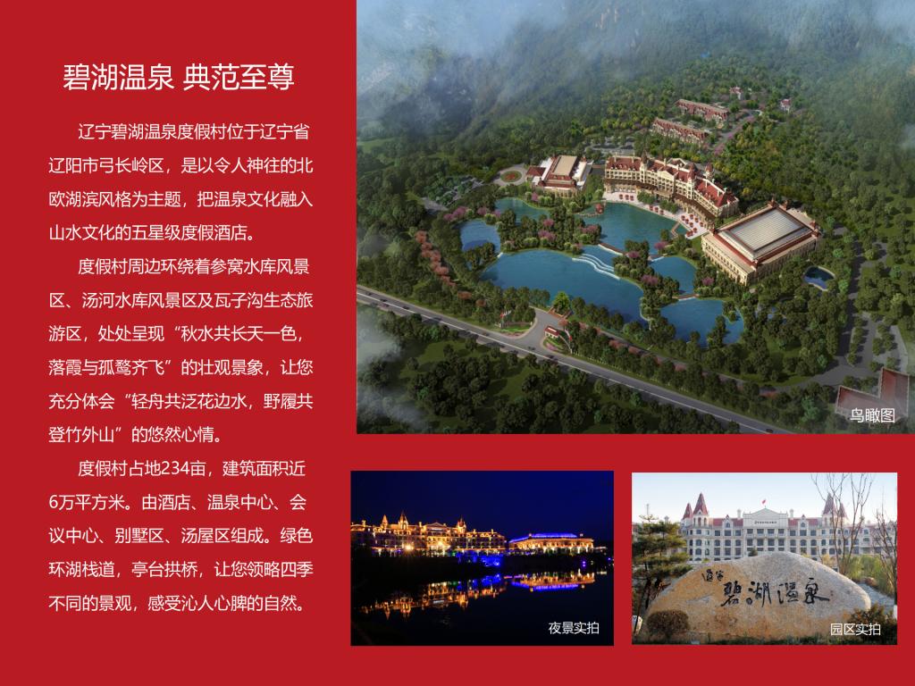 碧湖温泉公司成立于2011年,位于青山碧水、环境清幽且温泉资源优越的辽阳市弓长岭汤河旅游度假区。主要经营范围有:会馆建设投资、会馆资产运营管理、温泉资源开发;住宿、洗浴,餐饮、会议服务等。