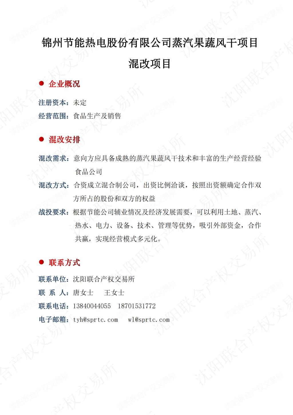 71.锦州节能热电股份有限公司蒸汽果蔬风干项目混改项目
