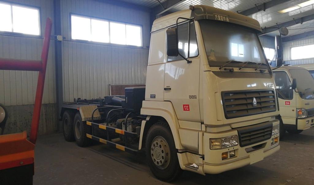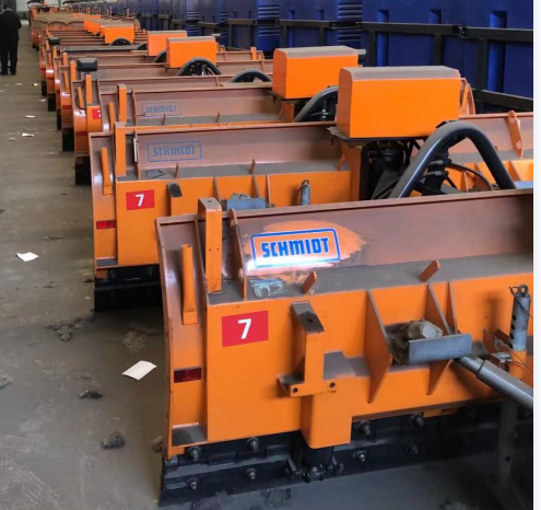 自卸车挂装除冰雪机具,可选用自卸车取力,也可车箱背负动力箱,机具挂装在车前部,换装方便,适合道路及场所的除冰雪作业。
