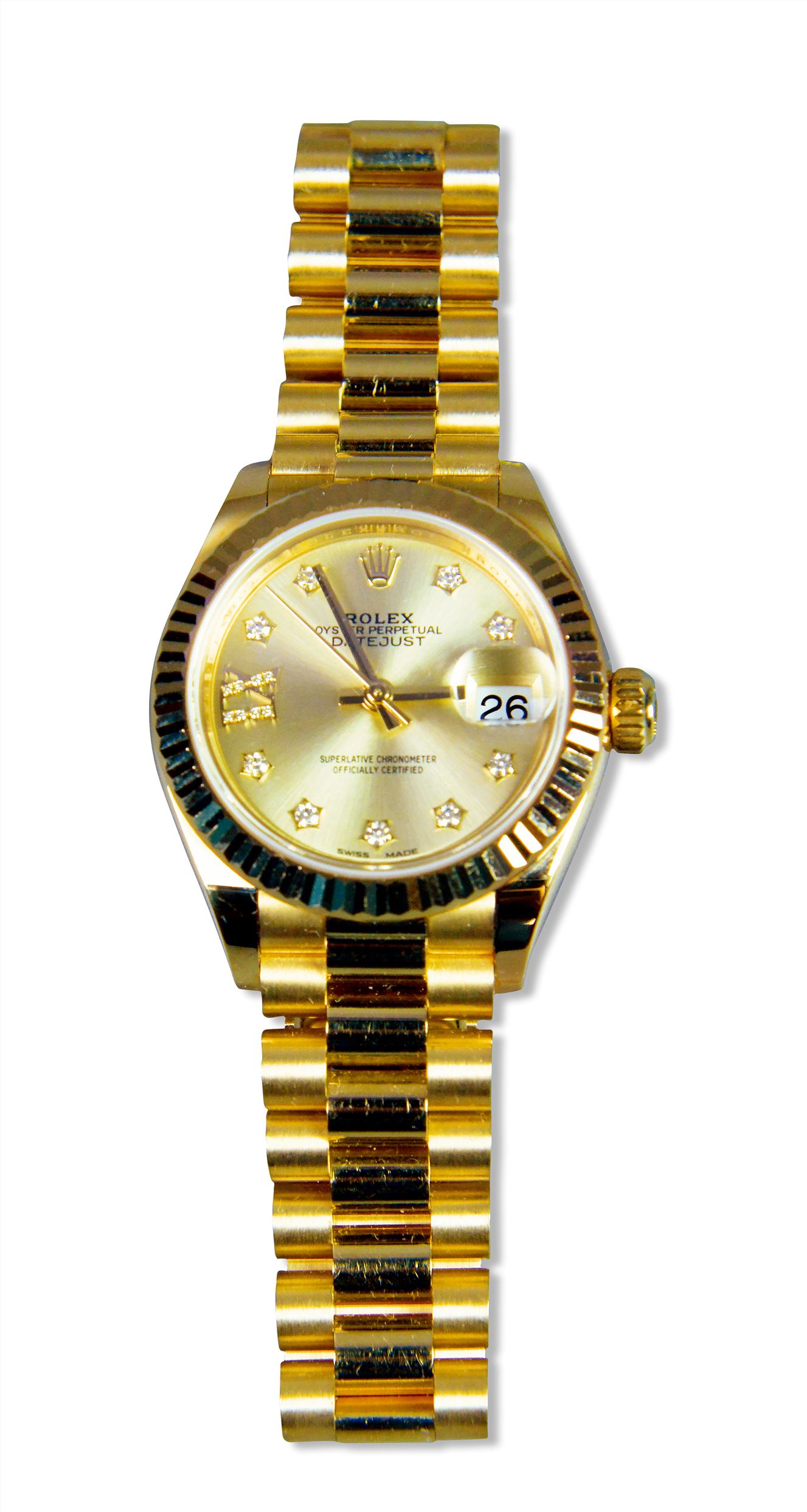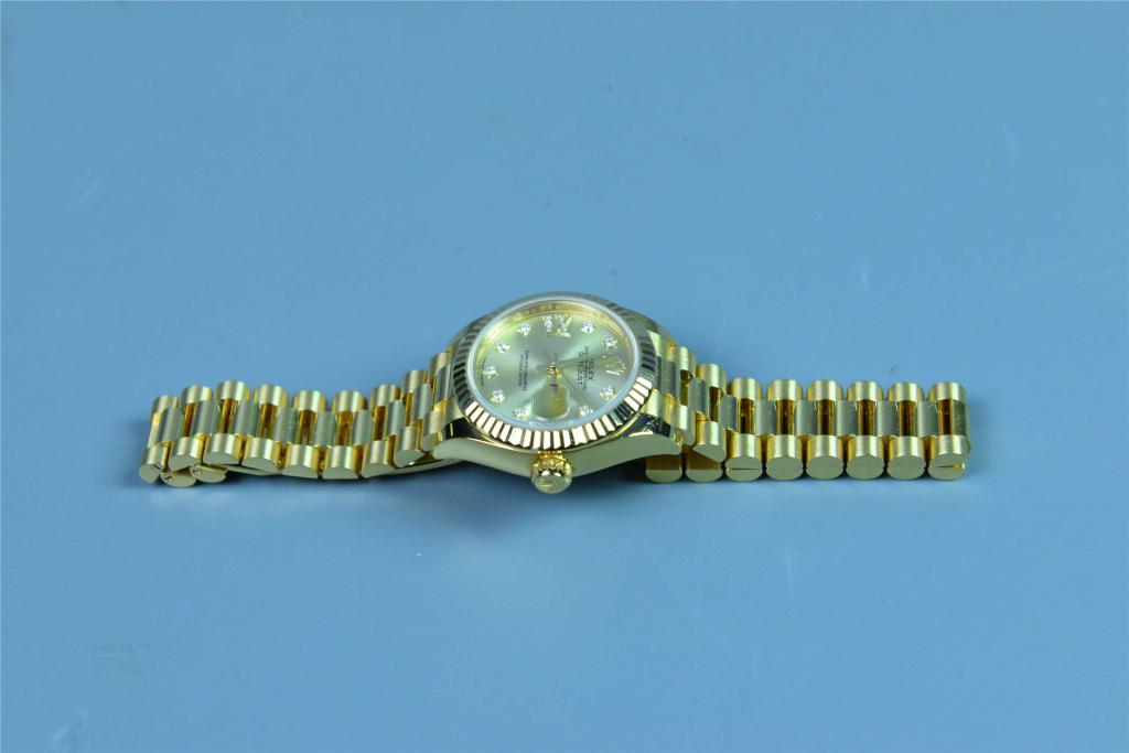 女装日志型,18K黄金表壳,香槟色圆形表盘, 刻度镶嵌钻石,三针日历,表径:28mm, 自动机械,18K黄金表带,18K黄金折叠表扣 |