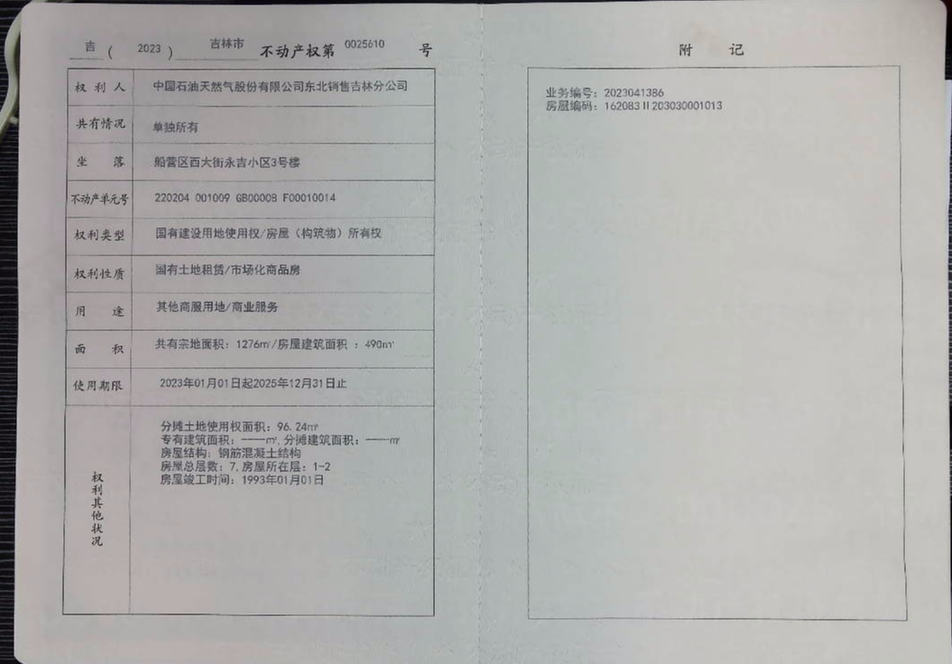 不动产权证编号为“吉(2023)吉林市不动产权第0025610号”,证载权利人为“中国石油天然气股份有限公司东北销售吉林分公司”。建筑面积490㎡,钢筋混凝土结构,房产所在楼层为1-2层,房屋设计用途为“商业服务”。土地用途为“其他商业用地”,土地性质为“国有土地租赁”,土地使用期限截止时间为2025年12月31日。