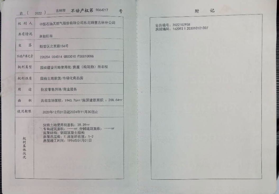 不动产权证编号为“吉(2022)吉林市不动产权第0064217号”,证载权利人为“中国石油天然气股份有限公司东北销售吉林分公司”。建筑面积208.64㎡,钢筋混凝土结构,房产所在楼层为1-2层,房屋设计用途为“商业服务”。土地用途为“批发零售用地”,土地性质为“国有土地租赁”,土地使用期限截止时间为2024年11月30日。