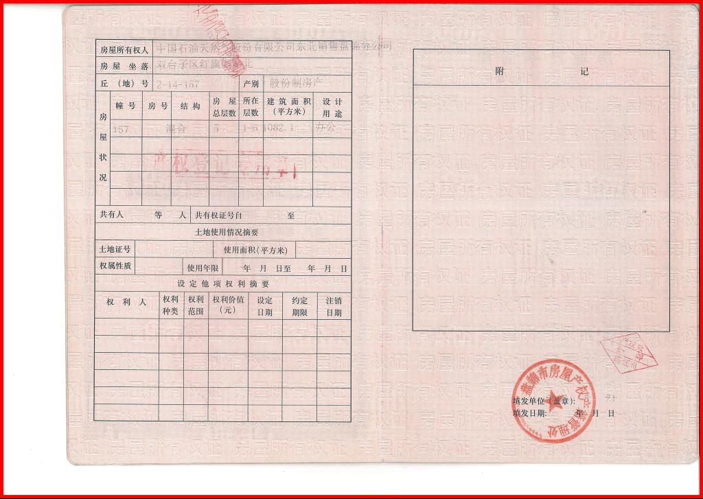 不动产权证(房产证)编号“盘房权证字第2006156号”,证载权利人为“中国石油天然气股份有限公司东北销售盘锦分公司”,建筑面积1080.10㎡,混合结构,共5层,房屋设计用途为“办公”,原房产用途为“办公楼”。土地用途为“其他商服用地”,土地性质为“授权经营”,土地使用期限截止时间为2039年6月29日。
