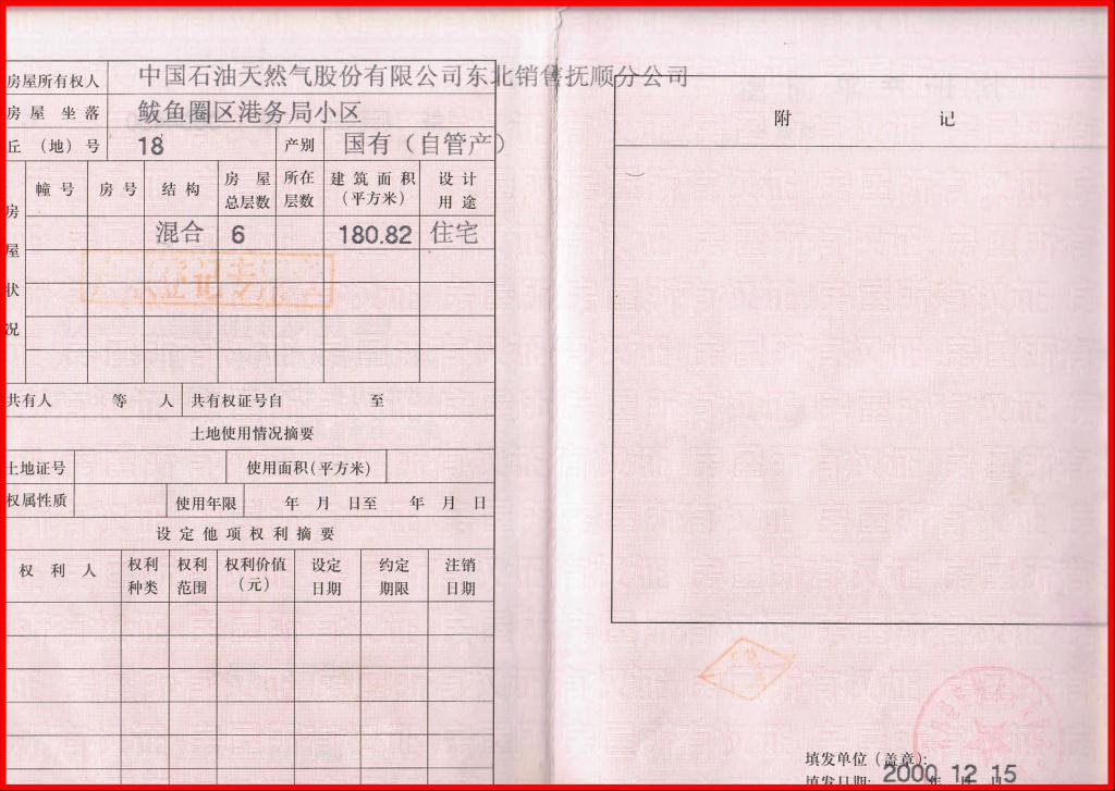 (二)住房房权证编号为鲅房权证字第0004460号,发证机关为营口市房产管理局。房屋所有权人为中国石油天然气股份有限公司东北销售抚顺分公司,建筑面积180.82㎡,产别:国有(自管产),混合结构,房屋总层数为6层,所在楼层302室和501室,房屋设计用途为住宅,两套房产使用一张房照。土地性质未知,发证时间为2000年12月15日。