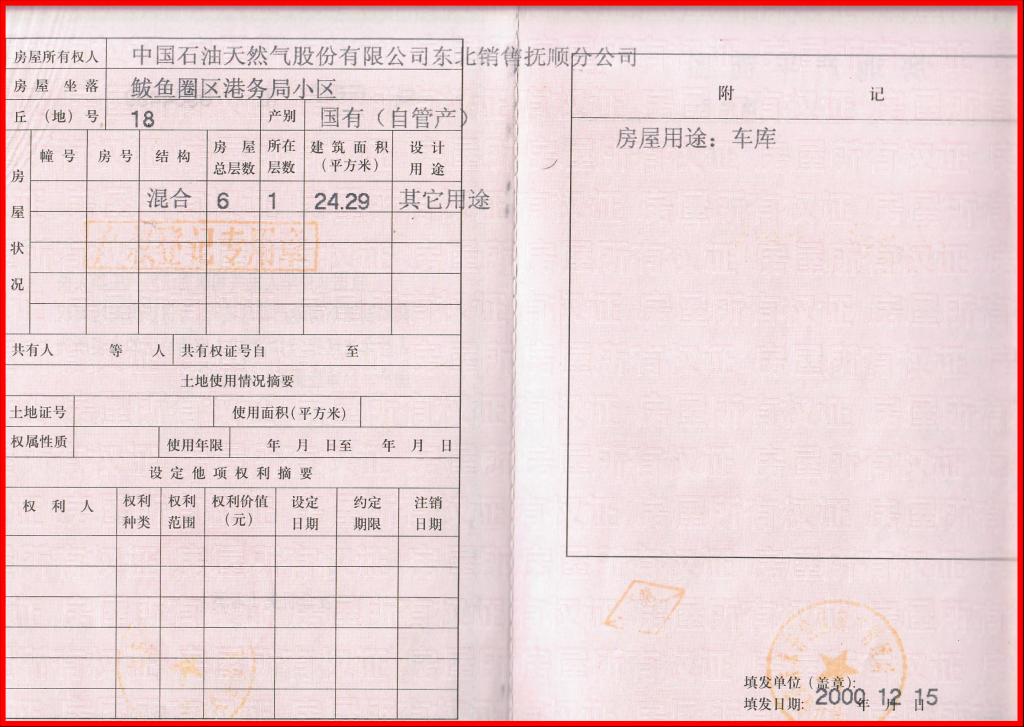 (一)车库房权证编号为鲅房权证字第0004459号,发证机关为营口市房产管理局。房屋所有权人为中国石油天然气股份有限公司东北销售抚顺分公司,建筑面积24.29㎡,产别:国有(自管产),混合结构,房产所在楼层为1/6层,房屋设计用途为其他用途。房屋用途为车库,土地性质未知,发证时间为2000年12月15日。