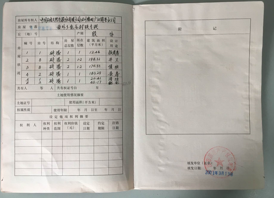 房产证编号“房权证广权字第9786-1号、房权证广权字第9789-1号”,证载权利人为“中国石油天然气股份有限公司四川德阳广汉销售分公司”,建筑面积120.63/12.44/198.32/170.53/183.29/20.41/46.17㎡,房屋设计用途为“消防泵房/扳道房/井卫/值班/泵房/消防/配电”。