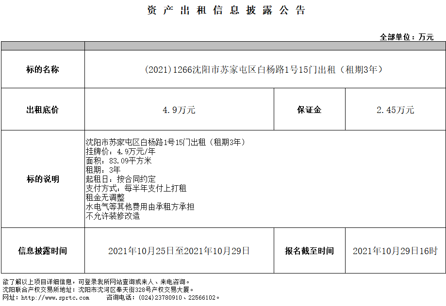 (2021)1266沈阳市苏家屯区白杨路1号15门出租(租期3年)