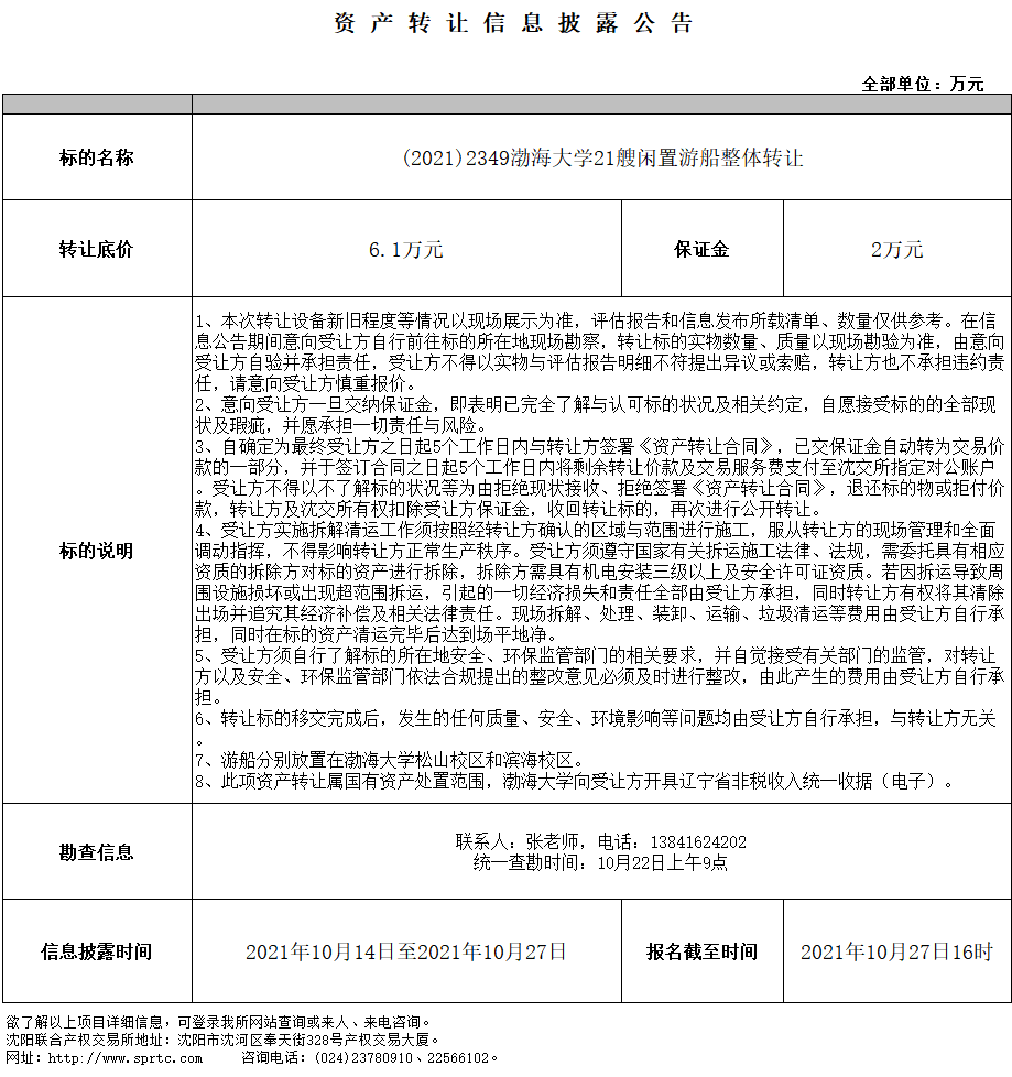 (2021)2349渤海大学21艘闲置游船整体转让