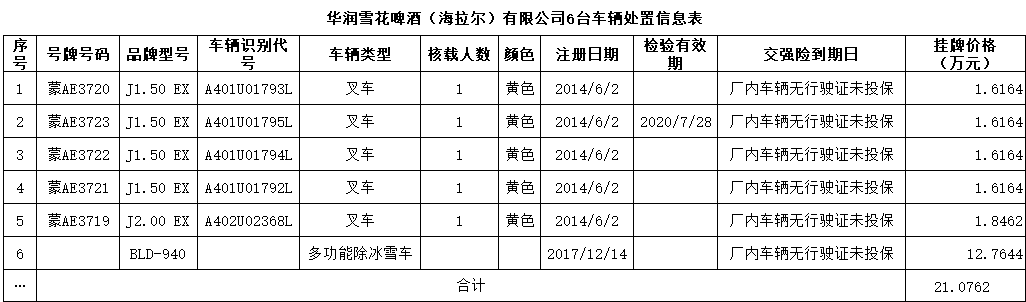 (2021)2340华润雪花(海拉尔)公司6台厂内车辆分别转让