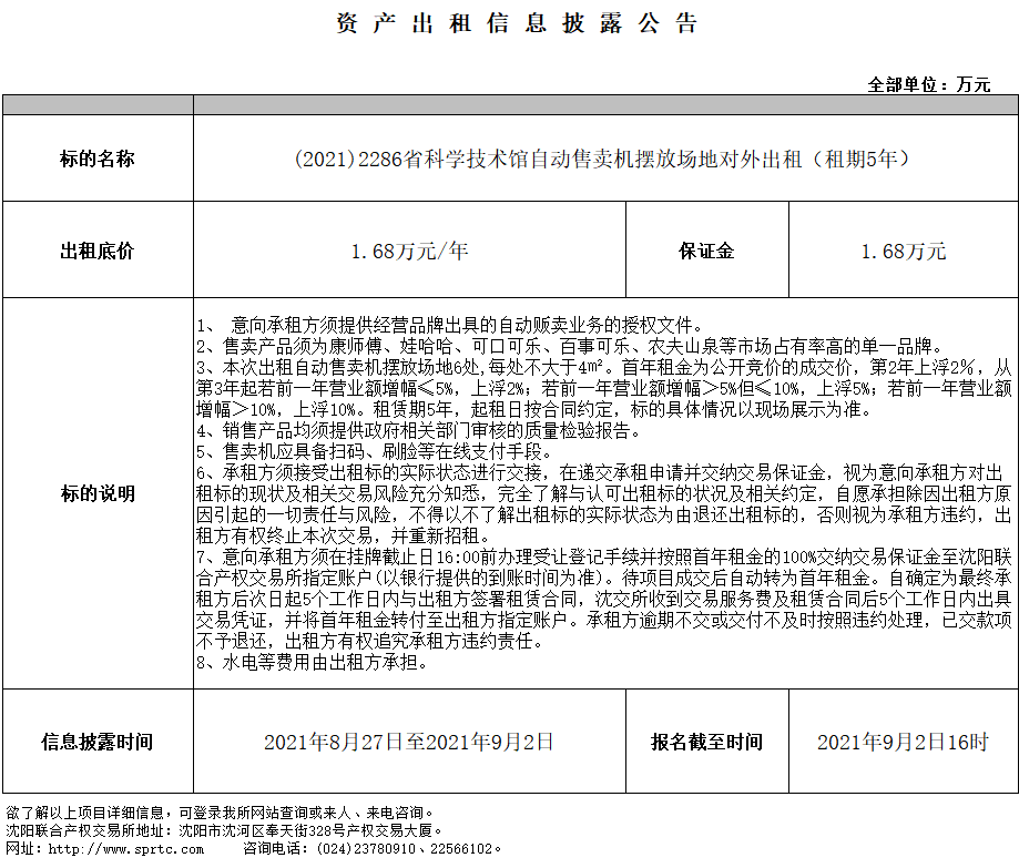(2021)2286省科学技术馆自动售卖机摆放场地对外出租(租期5年)