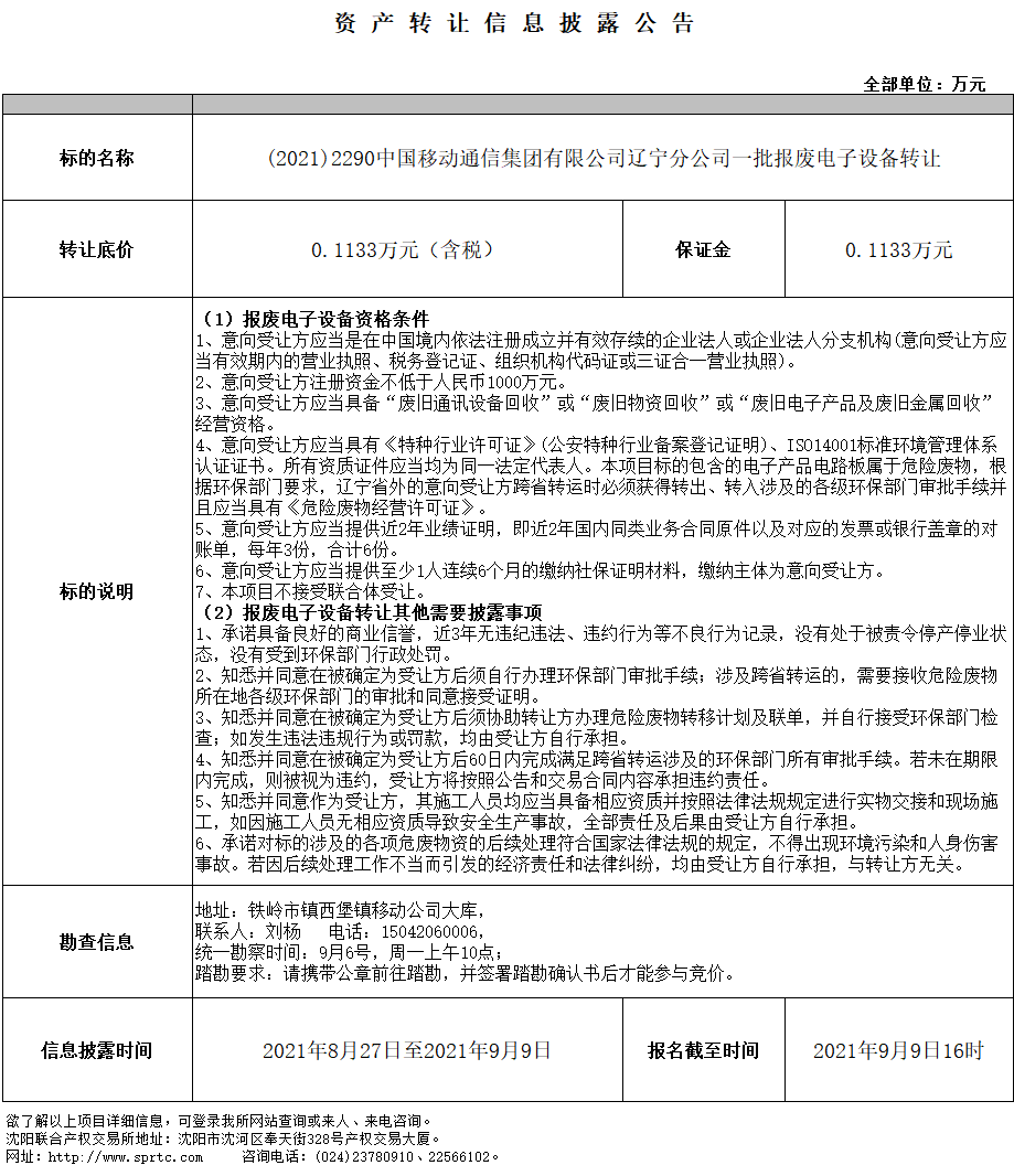 (2021)2290中国移动通信集团有限公司辽宁分公司一批报废电子设备转让