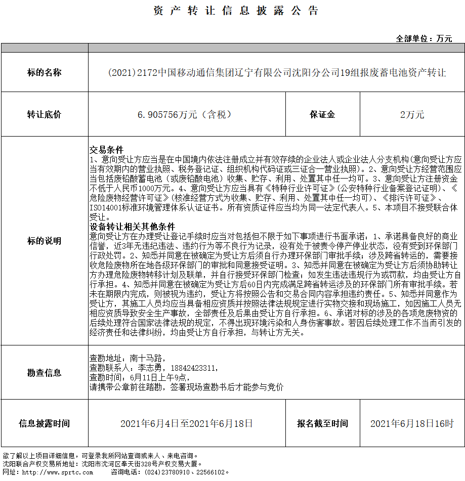 (2021)2172中国移动通信集团辽宁有限公司沈阳分公司19组报废蓄电池资产转让