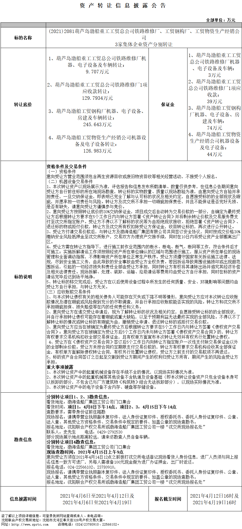 葫芦岛渤船工贸铁路维修厂机器、电子设备及车辆转让