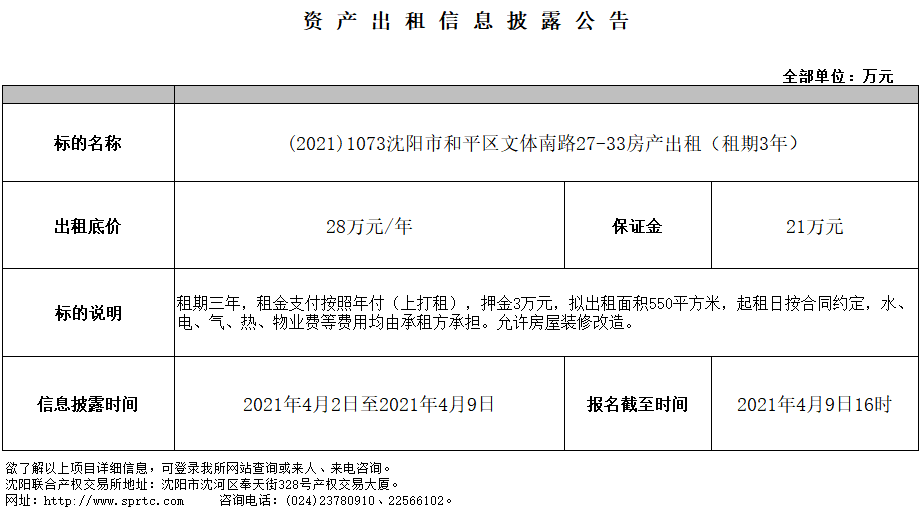 (2021)1073沈阳市和平区文体南路27-33房产出租(租期3年)