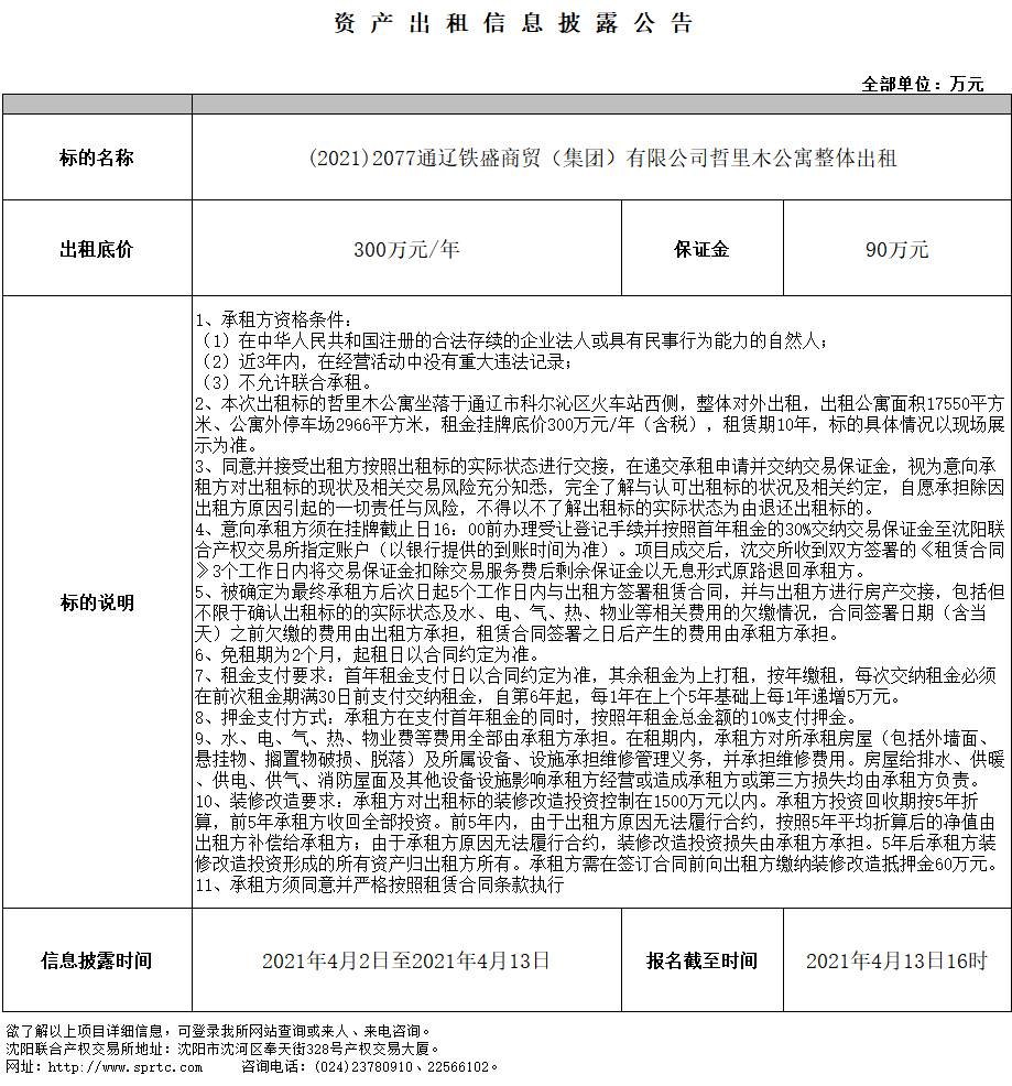 (2021)2077通辽铁盛商贸(集团)有限公司哲理木公寓整体出租