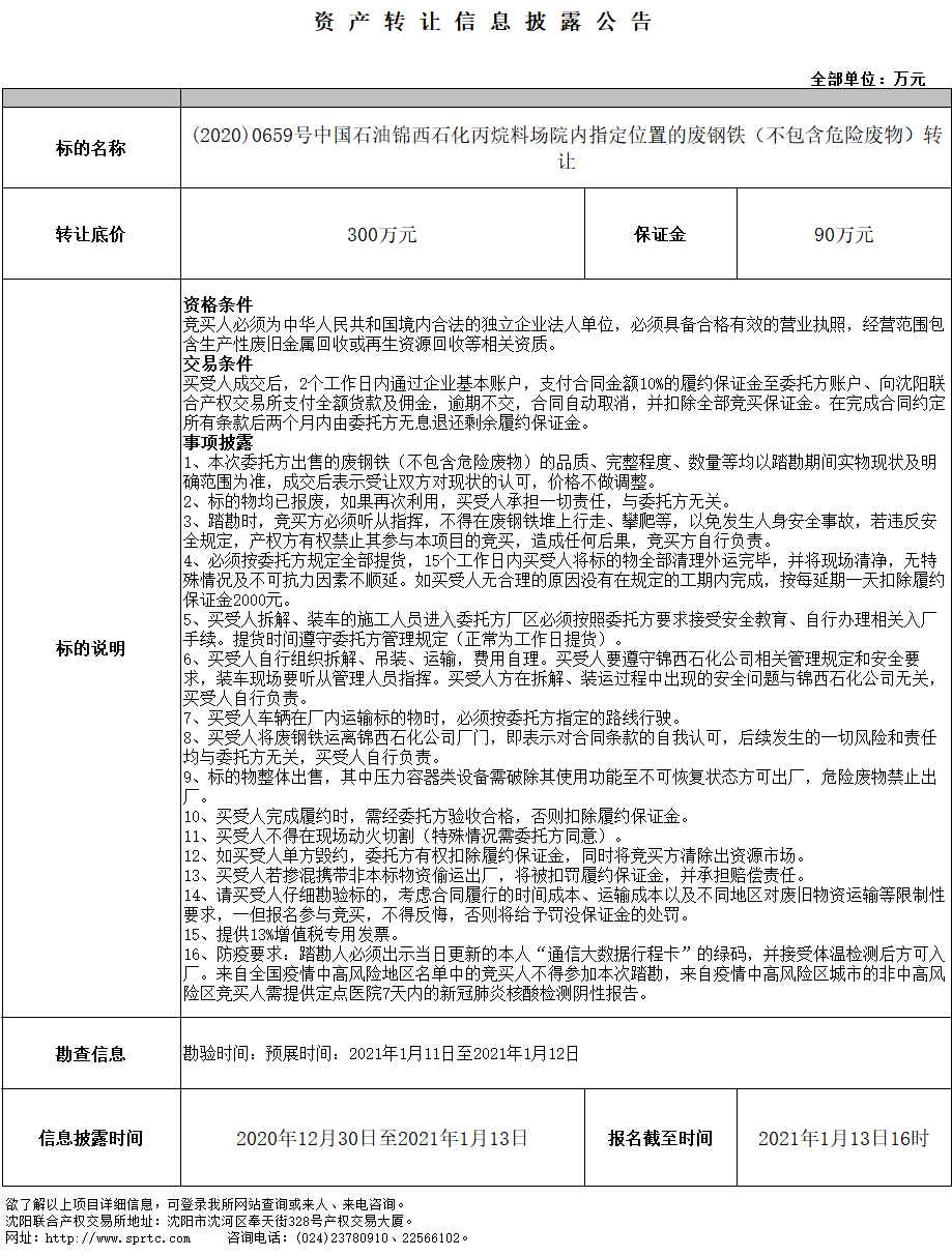 (2020)0659号中国石油锦西石化丙烷料场院内指定位置的废钢铁(不包含危险废物)转让