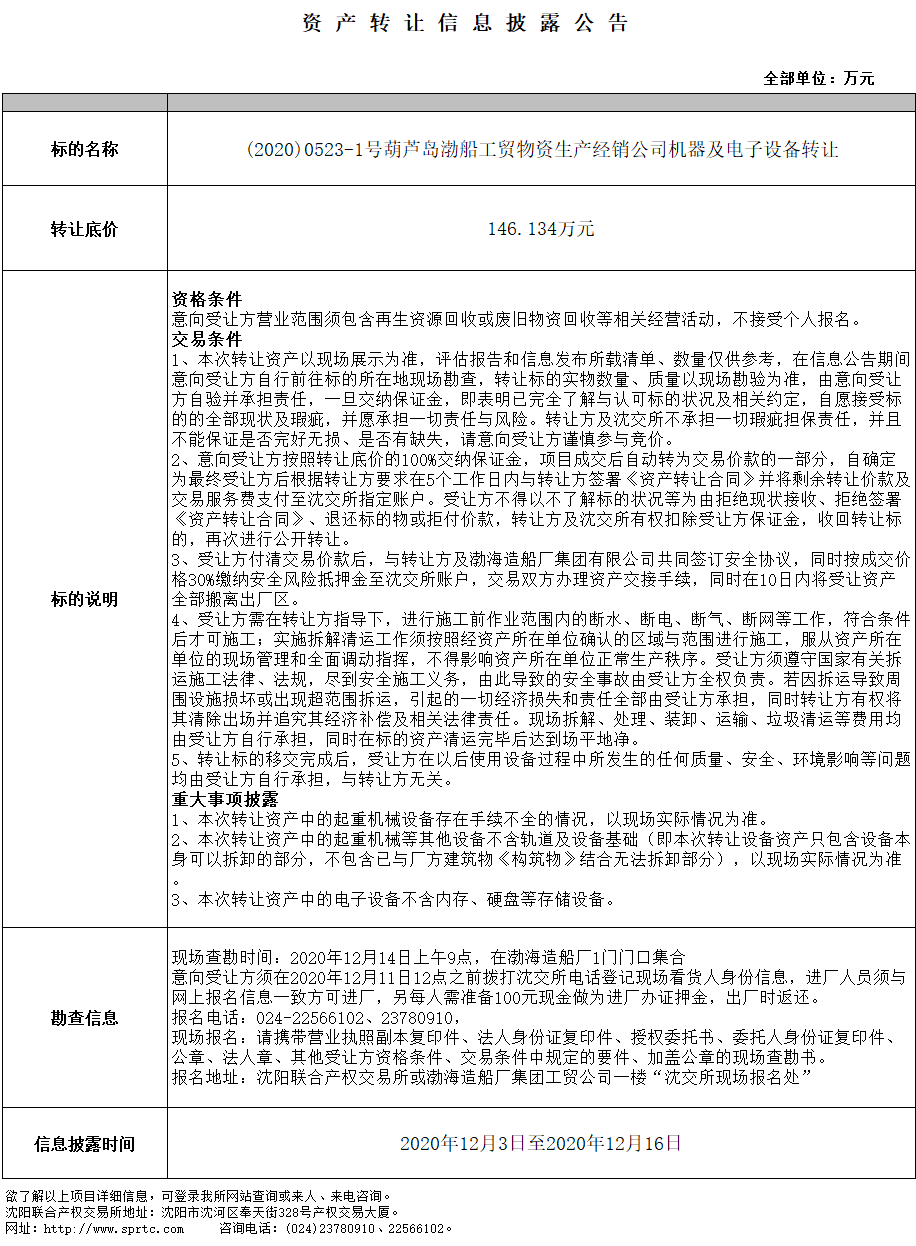 (2020)0523-1号葫芦岛渤船工贸物资生产经销公司机器及电子设备转让